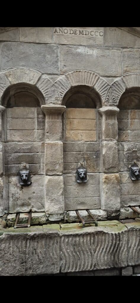 Justo al lado encontrarás también la Fuente del Perro, una de esas pequeñas curiosidades del Casco Viejo. Ni tiene perro ni tiene nada que ver con ellos; su nombre viene de una confusión popular sobre los “perros” grabados en la piedra que, en realidad, son leones estilizados. Es perfecta para contarles esa historia a los jóvenes… y para hacer la típica foto curiosa.