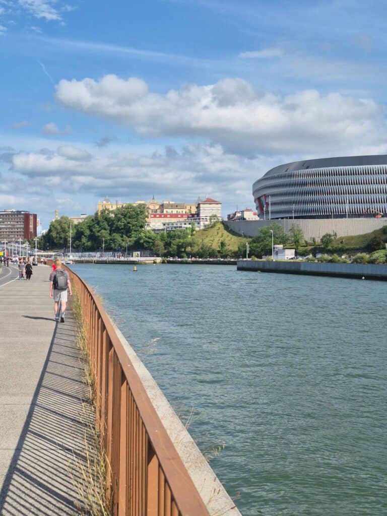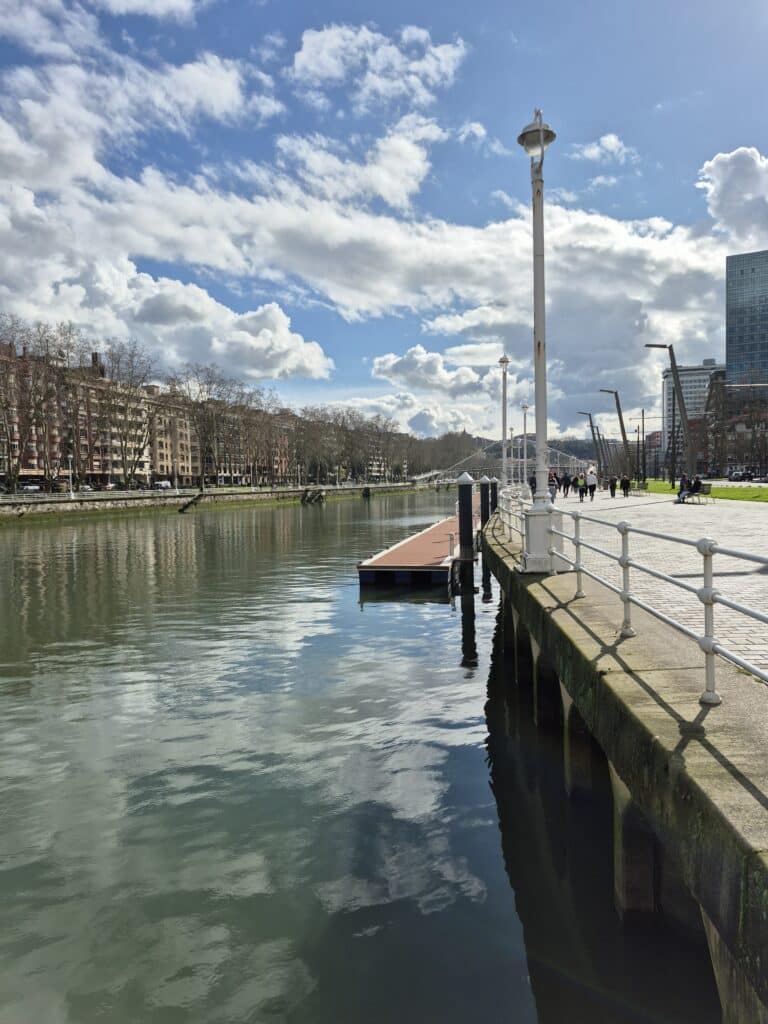 Según avanzáis, el Guggenheim se va quedando a la espalda y aparecen nuevas vistas: la ría, los puentes, las fachadas del Ensanche… y, poco a poco, el perfil del Ayuntamiento de Bilbao al fondo. Es un tramo ideal para dejar que los adolescentes vayan haciendo fotos, grabando vídeos o simplemente caminando a su ritmo: hay espacio, se respira aire tranquilo y la ciudad se ve preciosa desde aquí.